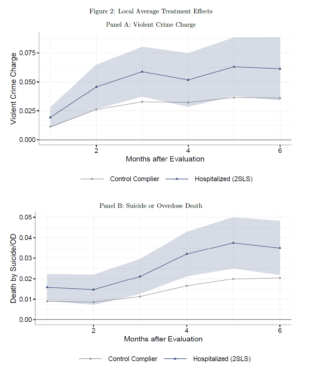 “For being charged with a violent crime, our reduced form estimate finds that a 10 percentage point increase in a physician’s tendency to hospitalize is associated with a 2.6 percentage point increase in being charged with a violent crime within the following 3 months.” [Emanuel, et al. 2025]