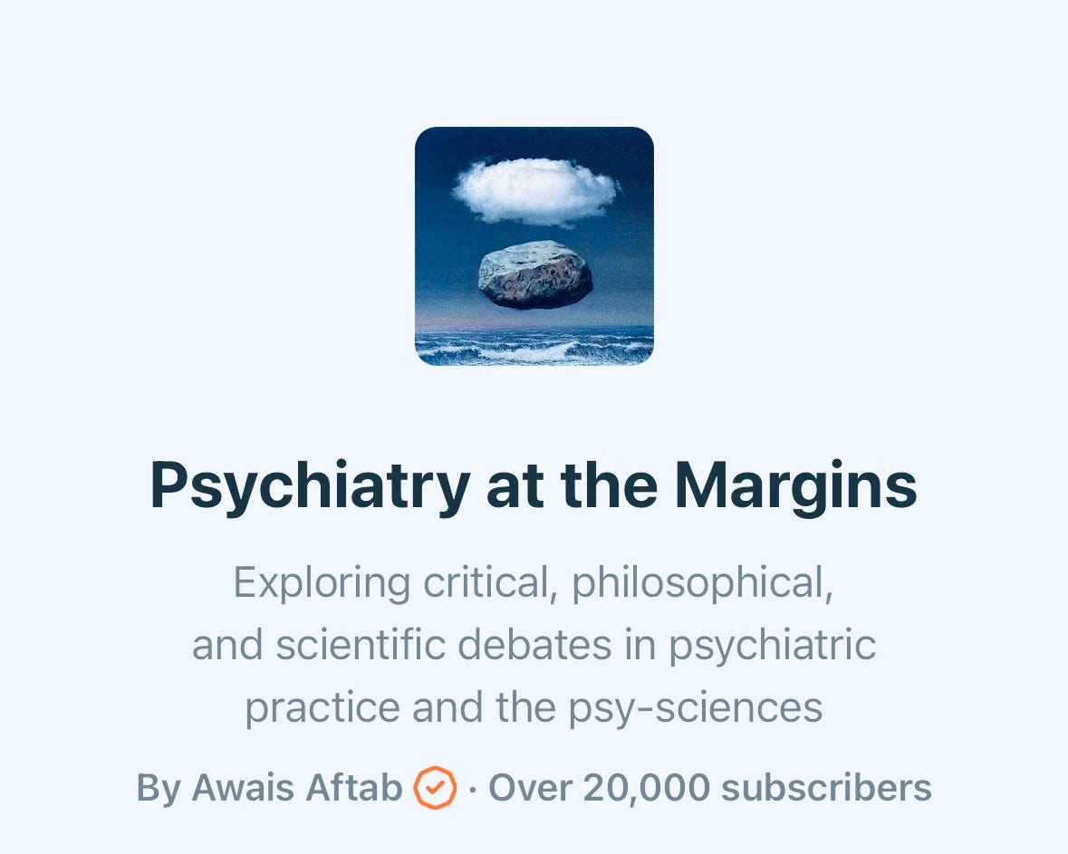 Earlier in March, Psychiatry at the Margins crossed 20K total subscribers. Welcome to all the new readers, and a warm hello to all the longstanding ones. This publication remains one of the most meaningful projects I’ve ever taken on, and seeing how it’s been received has been a gift. Thank you for being a part of it. If you’ve started following the blog recently, do explore the archive.